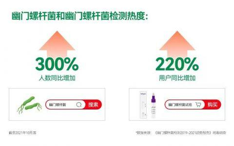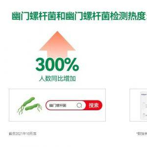 “一人感染幽门螺杆菌,全家需筛查”“感染幽门螺杆菌或诱发胃癌”……幽门螺杆菌,简称Hp,是目前所知能在人胃中生存的唯一微生物种类。在双11期间,京东健康联合万孚健康在11月9日发布《幽门螺杆菌检测2019-2021趋势报告》(以下简称《报告》)显示,截至2021年10月底,搜索“幽门螺杆菌”的人数同比增加了300%;购买幽门螺杆菌检测试纸的用户同比增长220%。