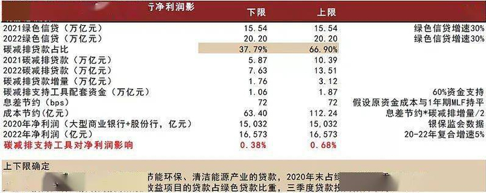 测算显示支持工具对商业银行净利润正面贡献约0.38%-0.68% 。 目前对于碳减排贷款尚无明确行业划分 , 根据此前央行 、 银保监会相关表述 , 我们推测碳减排贷款占绿色贷款比重在37.79%-66.90% ( 上下限来源请参考图表1 ) , 假设2021-2022年绿色信贷增速保持在30%左右 , 碳减排支持工具提供的配套资金规模约为1.06-1.87万亿元 。 静态情景下 , 对2022年商业银行净利润正向贡献约0.38%-0.68% ( 以上测算均基于一定假设 , 可能有一定误差 ) 。