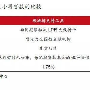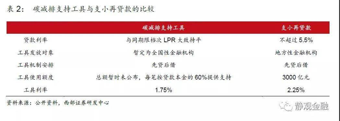 宏观 碳减排支持工具落地, 利率明显低于其他再贷款 。 2021年11月8日 , 碳减排支持工具落地 , 发放对象暂定为全国性金融机构 , 人民银行通过 “ 先贷后借 ” 的直达机制 , 对金融机构向碳减排重点领域内相关企业发放的符合条件的碳减排贷款 , 按贷款本金的60%提供资金支持 , 利率为1.75% 。 碳减排支持工具期限为1年 、 可以展期2次 , 并不是永久性资金 。 目前1年期支农 、 支小再贷款利率为2.25% , 碳减排支持工具的利率比支农支小再贷款再低50bp 。