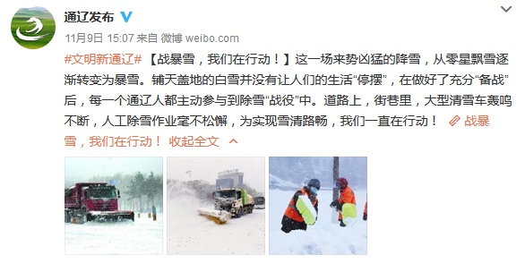 11月7日、8日,内蒙古通辽连续两日出现特大暴雪。从7日10时至9日早,强降雪已经持续约46小时,积雪深度达到59厘米,打破了1951年来纪录。