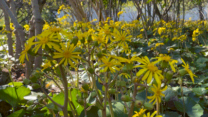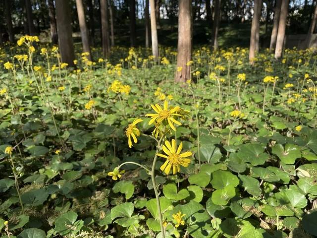 大吴风草喜欢半阴的环境,生命力旺盛,地面覆盖能力强,株形饱满,叶片形态奇特,花色亮丽,多种植于园林、庭院的阴处或者树下林间。在树木的遮掩下,它能很好地生长,绿树下开放着灿烂的金黄色花朵,看着极为赏心悦目。