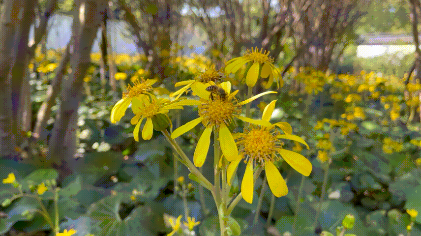 迎着瑟瑟秋风,方塔园内的大吴风草抽出花葶,绽放出朵朵黄花,身姿傲人。