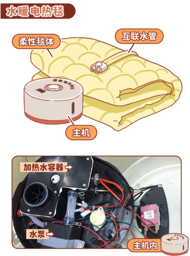 市面上最常见的水暖电热毯由主机、柔性毯体和互联水管组成,加热水容器在毯体外部,毯体内无带电元件。