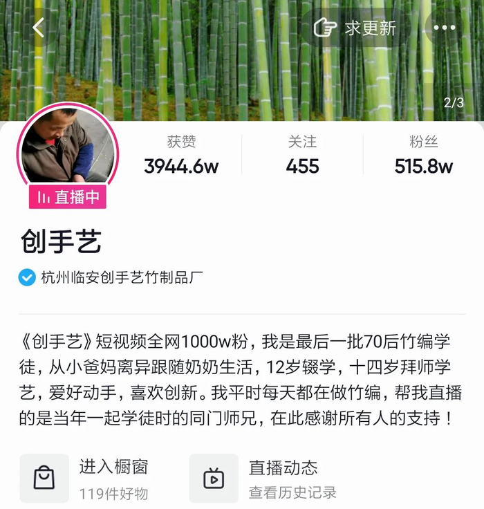 有一次,潘云峰无意间在抖音里刷到一个名字叫老篾匠的短视频账号。对方是一位年纪相仿的竹编师傅,粉丝虽然只有几百人,但他觉得亲切,反复观看,没几天,对方粉丝居然已经过万。在短视频平台上,类似的传统手艺人还有很多。