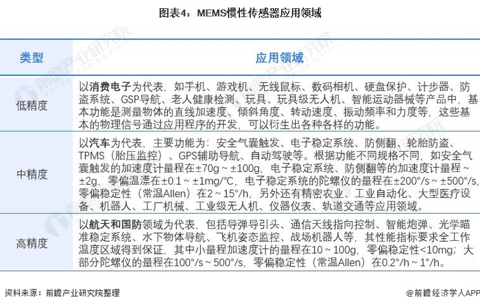按MEMS惯性传感器的不同精度来看,低精度MEMS传感器主要应用于消费电子领域,中精度MEMS传感器主要应用于汽车行业,高精度MEMS惯性传感器主要应用于航天和国防领域。随着高精度MEMS惯性传感器的不断更新迭代,未来应用领域将更为广泛。