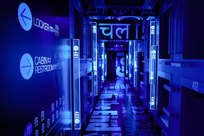 和传统酒店刻意营造优雅静谧的氛围不同。从酒店前台撞色的潮流玩具,走廊上排列成几何形状蓝色灯管,到房间里看起来很贵、性能很好的高配置电脑,每一处细节和设计仿佛都在挑逗你的感官神经。