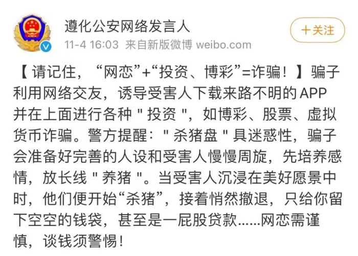 警方提醒:“杀猪盘”始于恋爱,热于投资,终于诈骗。不是你不小心,是骗子比你“懂”感情。