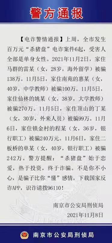 南京市委政法委官方微博11月8日下午发布的一则电诈警情通报显示,上周,南京全市发生百万元及以上“杀猪盘”电诈案件6起。