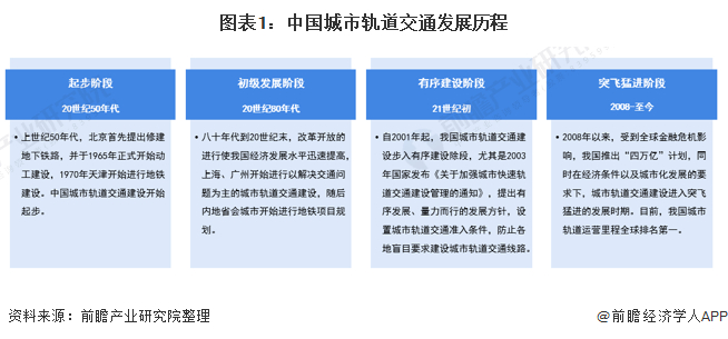 目前,我国城市轨道交通发展较为迅速,但是过去由于经济实力和技术水平的限制,我国城市轨道交通建设相较于西方国家整体起步较晚。随着近年来城市轨道交通的发展建设,轨道交通相关产业也随之强大起来。整体来看,我国轨道交通发展历程可以大致分为四个阶段,当前我国城市轨道交通发展历程处在突飞猛进阶段。