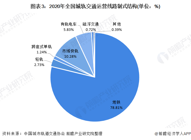 截至2020年底,城轨交通运营线路中共有8种制式同时在运营,分别是地铁、轻轨、跨座式单轨、市域快轨、有轨电车、磁浮交通、自导向轨道系统、电子导向胶轮系统。其中,地铁运行里程数最高为6280.8公里,占比78.81%,为当前国内运营线路里程数最高的城市轨道交通类型。