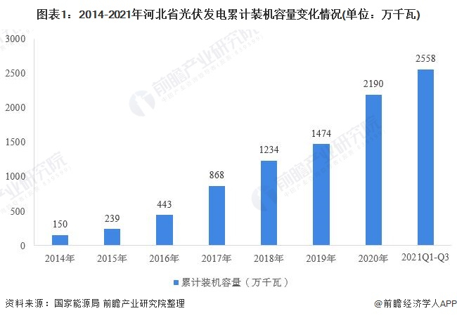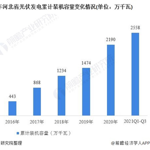 截至2021年第三季度,河北省光伏累计装机容量为2558万千瓦,目前,河北省光伏装机总容量仅次于山东。