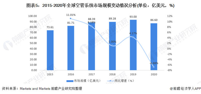 2、全球空管系统市场规模估测:2020年达到86.6亿美元,同比下降6.88%