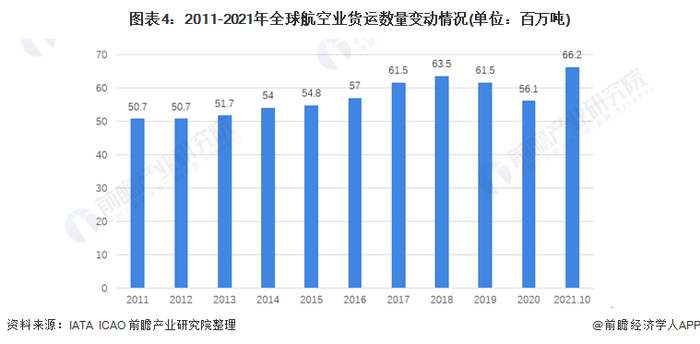 根据IATA ICAO披露数据显示,2011-2021年全球货运发展整体变动较为稳定,2020年疫情给全球民航货运虽然也带来了冲击,但其影响程度远低于客运。2020年疫情前货运量为0.62亿吨,疫情后下降至0.56亿吨,与2016年货运量基本持平,截止2021年10月,全球货运量回升至0.66亿吨,“后疫情”时代恢复态势较好。