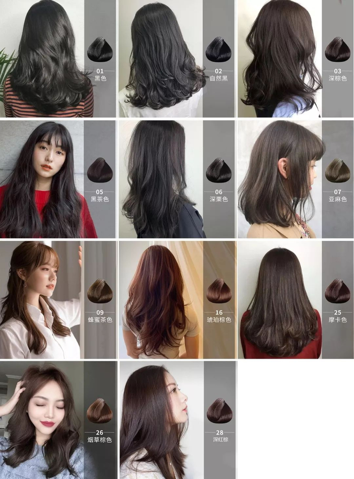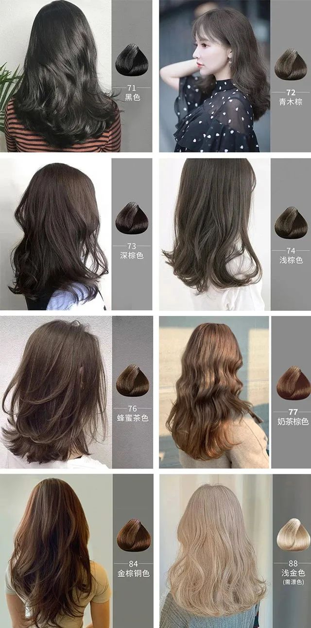 (因每个人原本发色不同、上色程度也不同,所以每个人的头发染后颜色都是不一样的,色卡只供参考)
