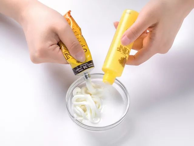 第一步:将上色剂与锁色剂按照1:1的比例混合,也就是放多少上色剂就得放多少锁色剂。
