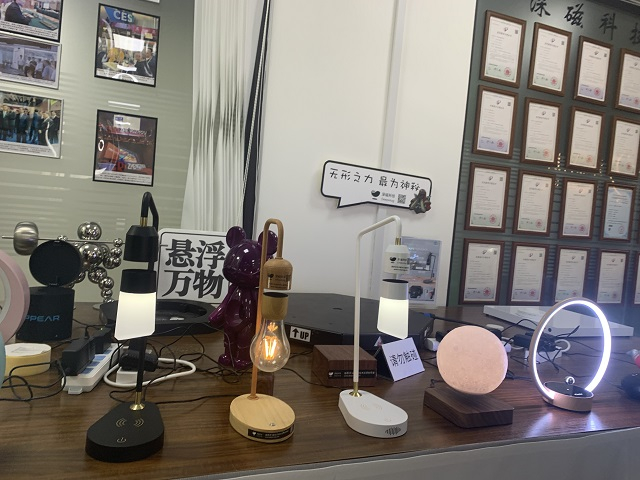 此后,还研发了磁悬浮技术应用在生活、消费等场景中的系列产品,比如利用磁悬浮推力悬浮在空中不断旋转的玩偶、悬浮在空中的声控台灯、珠宝展示台悬浮着的首饰等。
