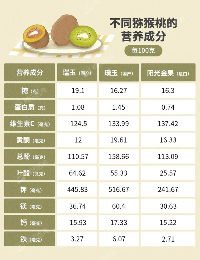 不过,猕猴桃虽然没那么甜,但是含糖量高,每100克含有14.5克碳水化合物[9],可不要贪吃哦!