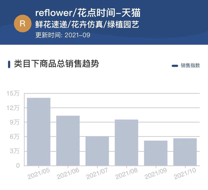 今年年初获得两轮新融资的花点时间单从线上销售看还是没什么起色。根据“魔镜市场情报”的数据,其5-10月销量呈波动下滑趋势。一个更现实的例子是,花点时间的促销短信早在双11前一个月就开始发送,但到双11当天,它天猫店里卖得最好的产品月销量只有6000件。