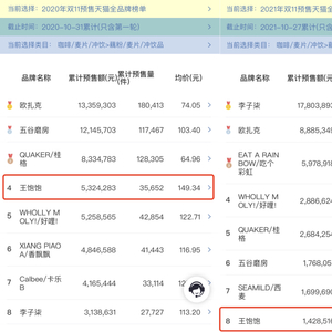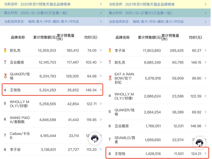 例如王饱饱和拉面说。根据根据线上行业市场品牌数据检测方“魔镜市场情报”的数据,在2020年天猫双11第一轮预售中狂揽532.4万元的王饱饱,今年同期对比下滑了近70%,只有142.9万元。