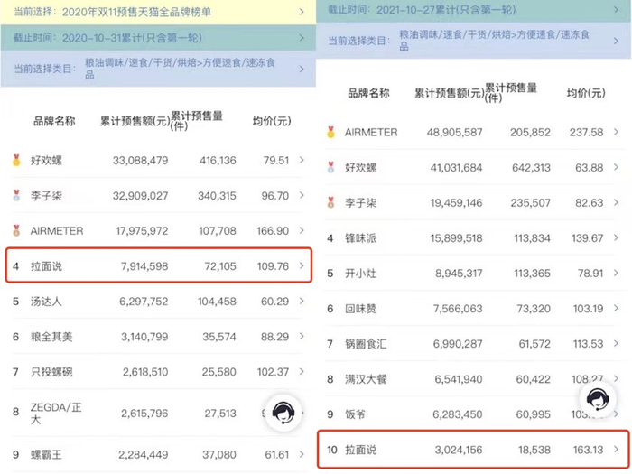 而依然位列“方便速食/速冻产品”类目第一轮预售排行前10名的拉面说,销售额与去年比接近腰斩。