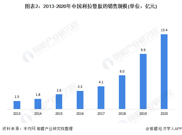利拉鲁肽(liraglutide-1)是人胰高血糖素样肽1(glucagon-likepeptide-1,GLP-1)的类似物,是糖尿病治疗的重要靶点,具有多种生理功能:血糖依赖性促进胰岛素分泌、保护胰岛β细胞、延迟胃排空降低食欲等。根据米内网的数据显示,近年来我国利拉鲁肽的销售规模呈现稳定上升态势,从2013年的1.5亿元逐年上升至2020年的13.4亿元。