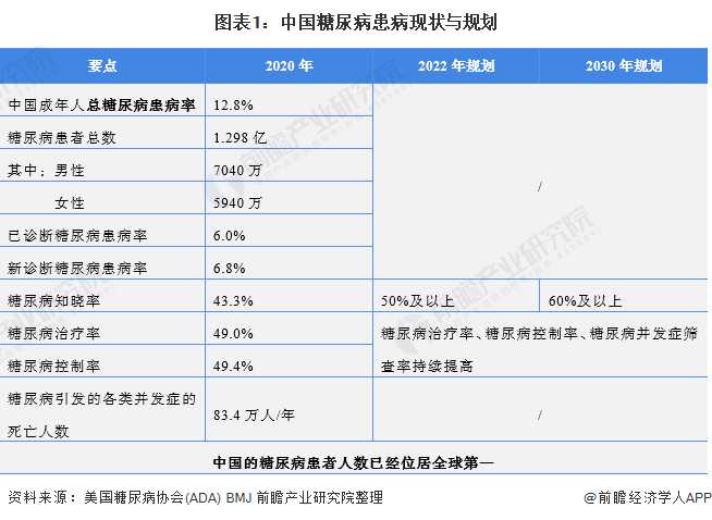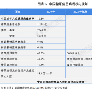 综合所述,目前,我国糖尿病患者人数已经位居全球第一;而《健康中国2019-2030》也指出到2022年和2030年,18岁及以上居民糖尿病知晓率分别达到50%及以上和60%及以上;糖尿病患者规范管理率分别达到60%及以上和70%及以上;糖尿病治疗率、糖尿病控制率、糖尿病并发症筛查率持续提高。