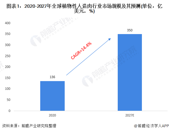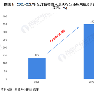 根据Research and Markets公布的数据预测,2020年全球植物性人造肉(由大豆、豌豆、小麦等植物制成的牛肉、猪肉、羊肉等)市场规模约为136亿美元,预计到2027年全球植物性人造肉行业市场规模有望达到350亿美元,2020-2027年年均复合增长率达14.4%。