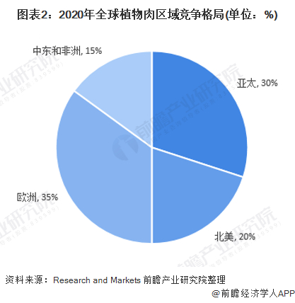 目前,欧美等国是全球主要的人造肉市场,根据Research and Markets公布的数据显示, 2020年欧洲植物性人造肉市场规模占全球的比重达35%,亚太的植物性人造肉市场规模占全球的比重约为30%,北美市场是第三大市场,约占20%。