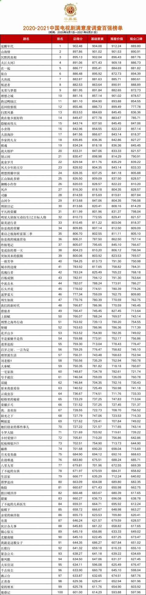 华鼎奖集团委托专业调研公司对这一期间各平台播出的300多部作品从“基础要素、观看价值、观众口碑”三个维度展开公众调查和打分,计算出总得分和排名,能够进入最终百强榜单的作品都是在这期间有较高水准、关注度和影响力的电视剧和网剧,排名高低总体体现了全国观众对这些作品的口碑评价。