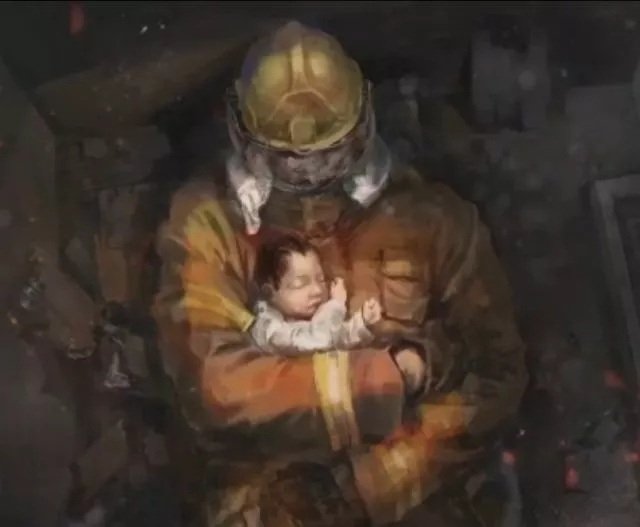 孩子身上还裹着他的消防作战服”
