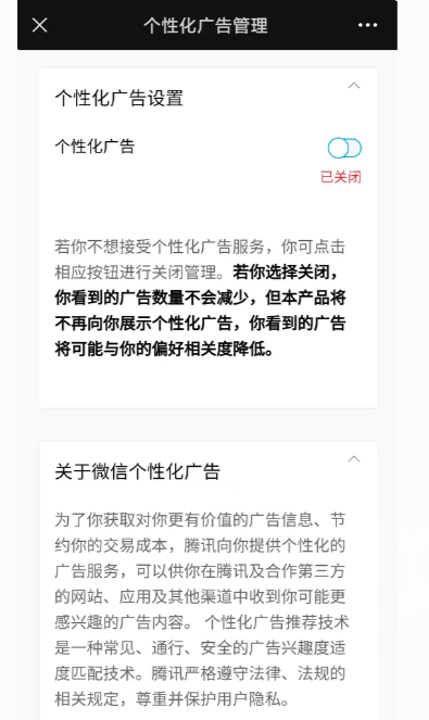 未来网民在微信上收到与个人信息相关的广告推动或将愈发减少,原因在于近日微信完成一次低调升级——增加个性化广告推荐的关闭入口。