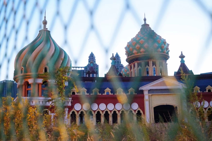 但是,越过蓝色围挡、看向建筑内部,多数人会被荒凉景象所震惊:毛坯建筑、钢筋水泥,硕大的多层商场渺无人迹。大约走半小时,转向建筑群背面,则会看到宛如末日将至时的城堡。傍晚,一辆运输车隆隆开过,月亮在工地污水上留下倒影。