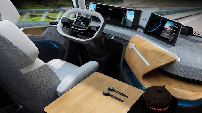 据其介绍,在家居设计布局方面,远程星瀚H整个座舱设计围绕卡车司机用车场景,应用家的理念,合理优化驾驶区和生活区,经过严谨的逻辑工效学和空间结构学研究,设计了包括淋浴房、洗手间、超级单人床、冰箱、煮茶器等,而且在车门下方还外置了厨房和洗烘一体洗衣机。
