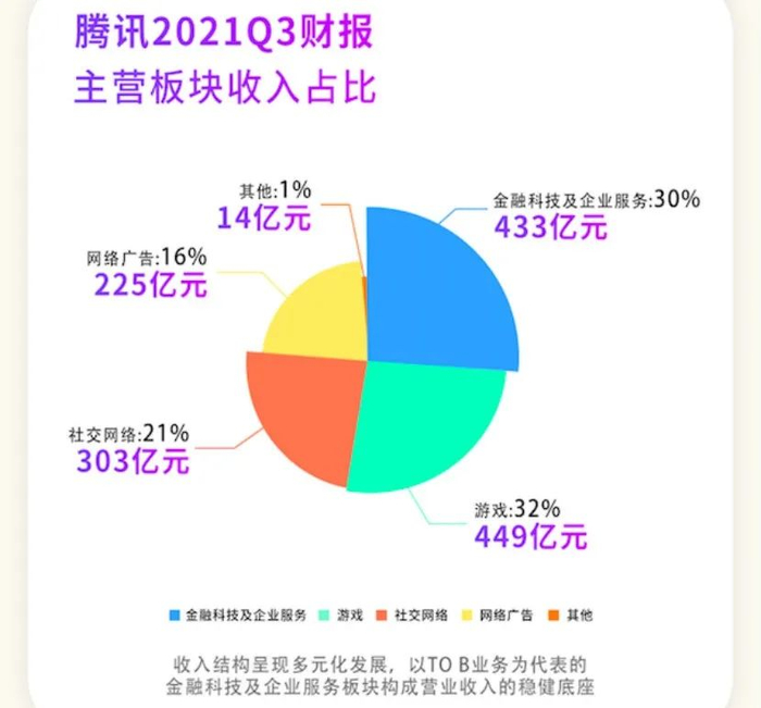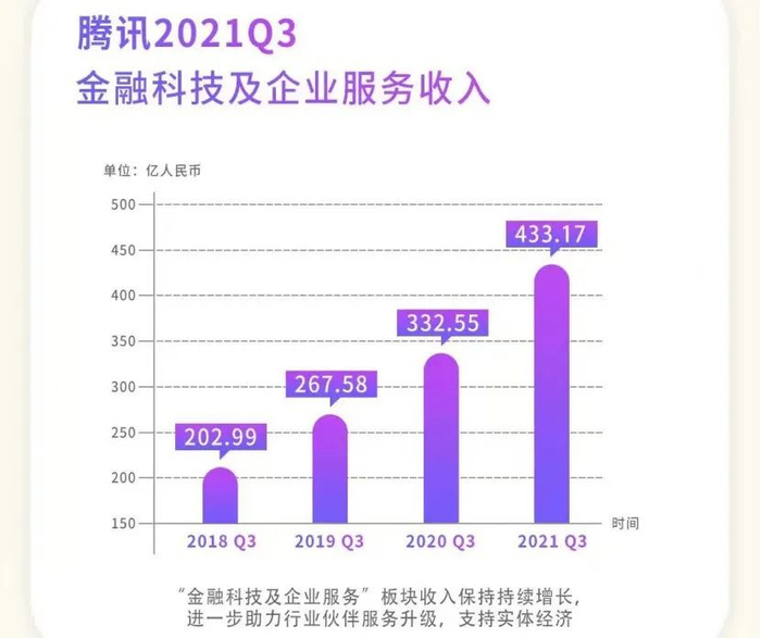 金融科技及企业服务业务方面,公司2021年第三季度的收入同比增长30%至433亿元。腾讯控股称,金融科技服务收入增长主要反映了商业支付金额的增加。企业服务收入同比增长,原因是日益加深的传统产业的数字化及互联网行业的视频化趋势,以及合并易车的企业服务收入的贡献。