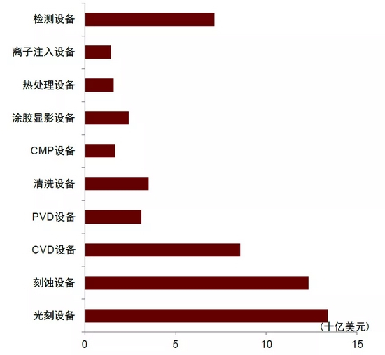 相对应地,半导体前道设备可以划分为光刻设备、刻蚀设备、薄膜沉积设备、清洗设备、CMP设备、涂胶显影设备、热处理设备、离子注入设备、检测设备等种类。