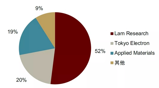 根据Gartner数据,2020年全球刻蚀机市场规模123亿美元:其中,导体刻蚀设备市场规模45亿美元,介质刻蚀设备市场规模78亿美元。2020年全球刻蚀设备行业前三名为Lam Research、Tokyo Electron、Applied Materials,三者总共占据90%以上市场份额。中国大陆企业中,中微公司的CCP刻蚀机接近全球一流水平,目前已经进入台积电最新工艺产线,北方华创的ICP刻蚀机在中国大陆技术领先。