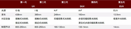 光源是光刻机的核心零部件之一,光源波长越短,光刻机分辨率越高,制程工艺越先进。根据光源波长不同,光刻机可以细分为EUV光源光刻机、DUV光源光刻机(ArF、KrF)、汞灯光源光刻机(I线、G线)。最早光刻机的光源是采用汞灯产生的紫外光源(UV),从G线一直发展到I线,波长缩小到365nm。随后出现准分子激光的深紫外光源(DUV)将波长进一步缩小到ArF的193nm。之后,业界开始采用极紫外光源(EUV)进一步提供更短波长的13.5nm光源。目前,EUV光刻机可应用在7nm以下的最高端工艺上,而目前只有荷兰ASML一家能够提供可供量产用的EUV光刻机。
