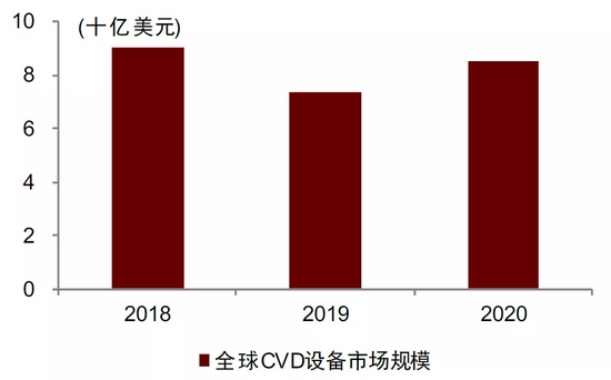 目前,CVD设备广泛应用于半导体工艺中各种薄膜沉积,如外延硅沉积、多晶硅沉积、电介质薄膜沉积和金属薄膜沉积。根据Gartner数据,2020年CVD设备(包含ALD设备)市场规模占薄膜沉积设备市场规模比例为64%,领先于其他类型薄膜沉积设备,PVD设备占比为25%,MOCVD设备占比为3%;Nontube CVD设备市场规模占CVD设备市场规模比例为86%;Plasma CVD设备市场规模占Nontube CVD设备市场规模比例为63%,ALD设备占比为24%。