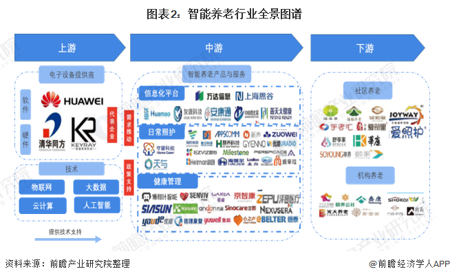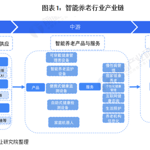 根据前瞻分析,智能养老的服务链上游有由物联网、大数据、云计算、人工智能服务商等技术,以及芯片、传感器等元器件供应商,和通讯模块、信息传感器等中间件供应商,此外也有护工培训、养老金融等。