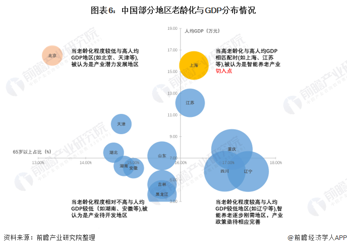 从我国智能养老产业集群区域分布来看,中国不同城市的老龄化进程配合不同地区消费水平的差异,将使得智能养老产品呈现出不同消费结构和热销品类。以上海为例,凭借它第一梯队的老龄化进程(65岁及以上人口占总人口16.3%),外加一流消费能力,将成为智能养老行业产业集群的理想市场切入口。