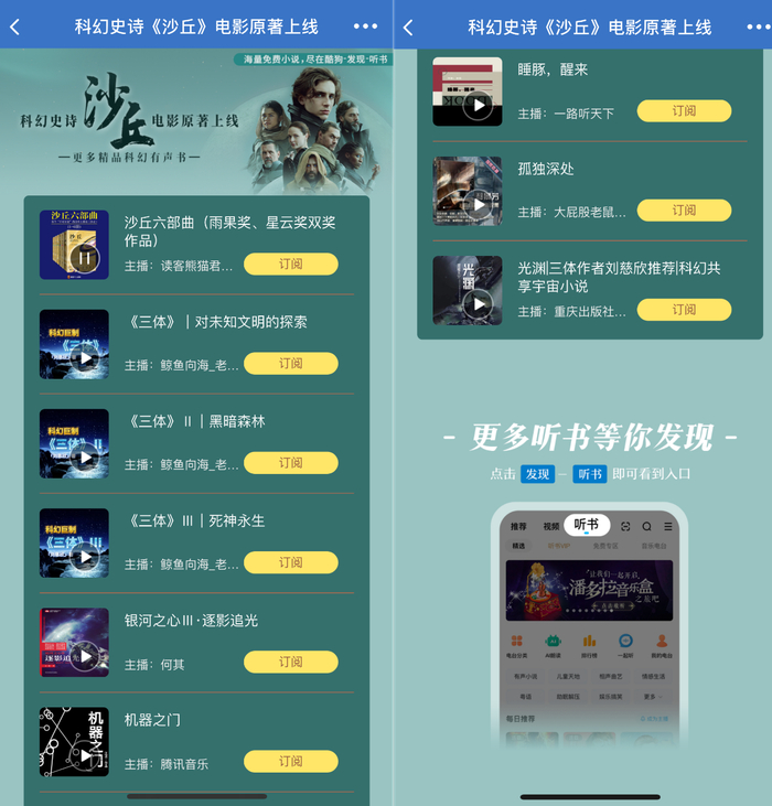 随着科幻大片《沙丘》的上映以及电视剧《三体》预告片的放出,国内再度掀起了一波科幻热。酷狗听书为广大科幻迷带来福利,《沙丘》原著有声小说全集限时免费,现在只要上酷狗APP搜索“沙丘”,即可收听。