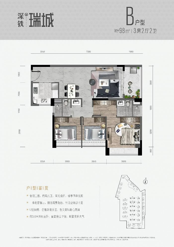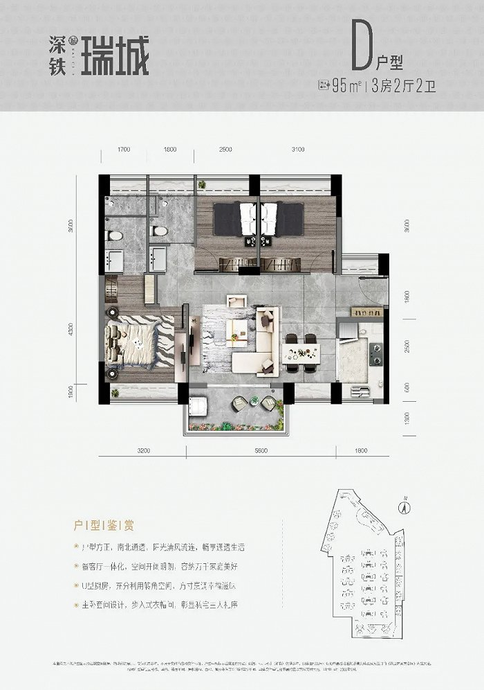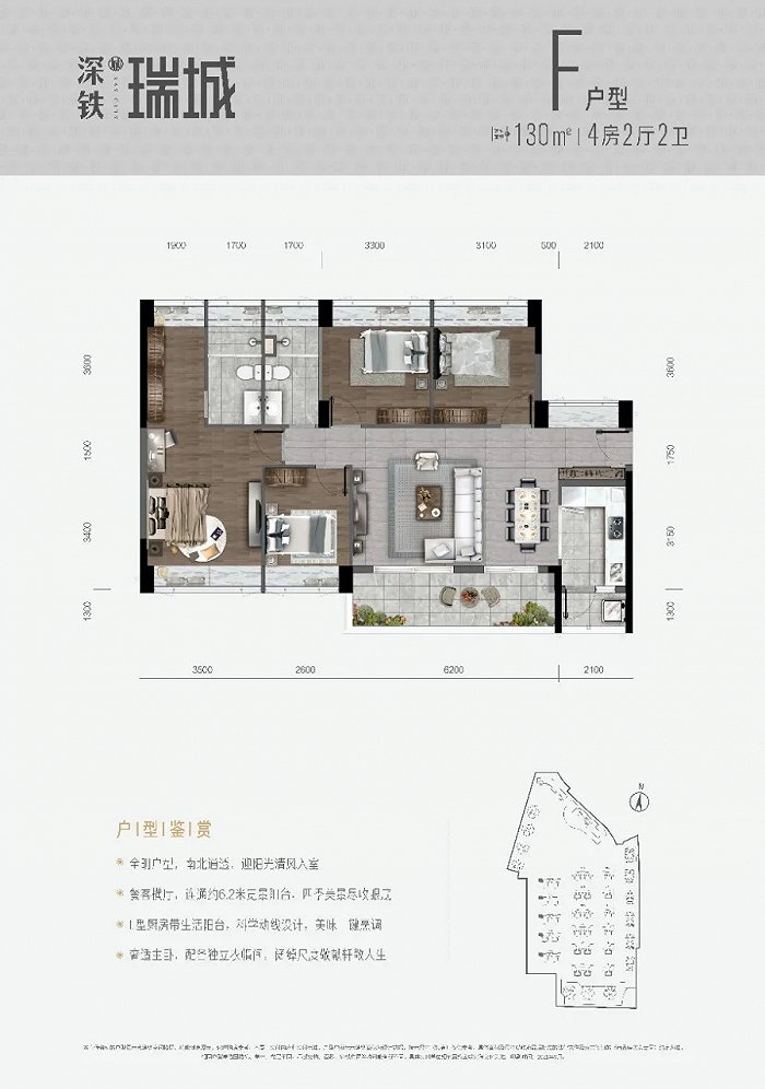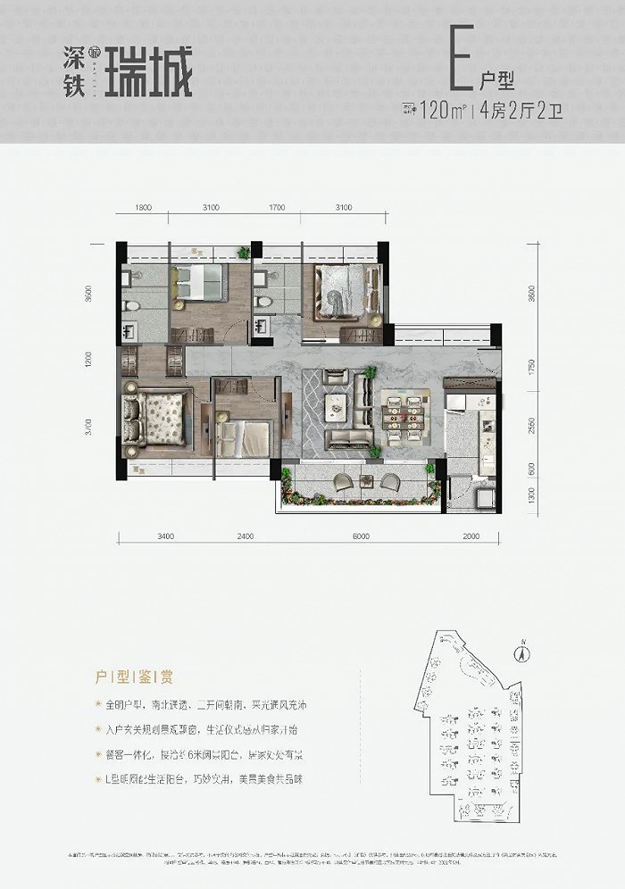 深铁瑞城为大型上盖综合体,体量达63万平方米,包含6万平方米商业、21班幼儿园、景观泳池等配套。
