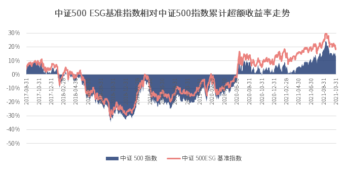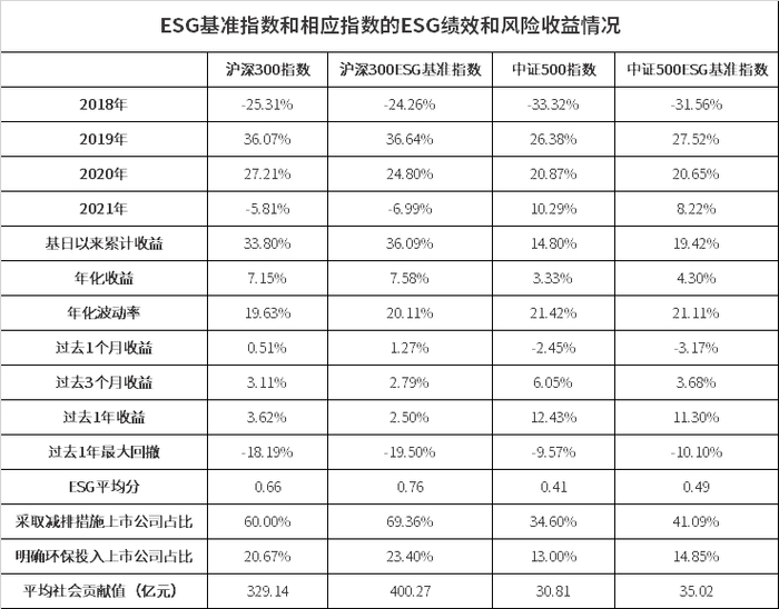 截至10月底,沪深300 ESG基准指数、中证500 ESG基准指数分别比母指数收益高2.29%和4.61%,两条指数中分别有69.36%和41.09%的上市公司采取明确碳减排措施,平均社会贡献值分别为400.27亿元和35.02亿元,均高于沪深300指数和中证500指数成份公司的相应指标,反映了ESG基准指数相对母指数在ESG方面的优异表现。