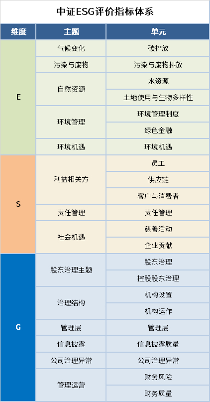 中证ESG评价体系包括环境(E)、社会(S)和公司治理(G)三个维度,由14个主题、22个单元和100余个指标构成。