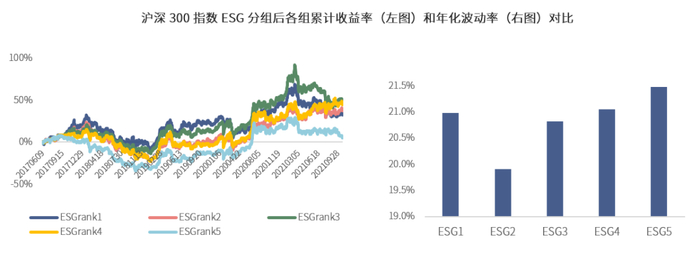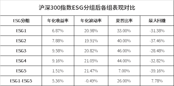 从可投资性来看,中证ESG评价体系具有良好的收益与风险区分度。将沪深300成份股按照ESG评价由高到低分为5组,ESG1为评分最高组,ESG5为评分最低组。从收益风险对比来看,ESG得分相对较高的4个组合相比评分最低的ESG5组合年化收益和夏普比率更高,最大回撤和年化波动率也更低。