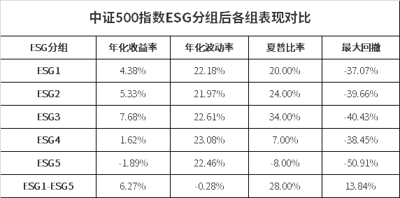 从中证500 ESG分组测试来看,ESG得分相对较高的4个组合相比低分组合年化收益和夏普比率更高,最大回撤也更低。