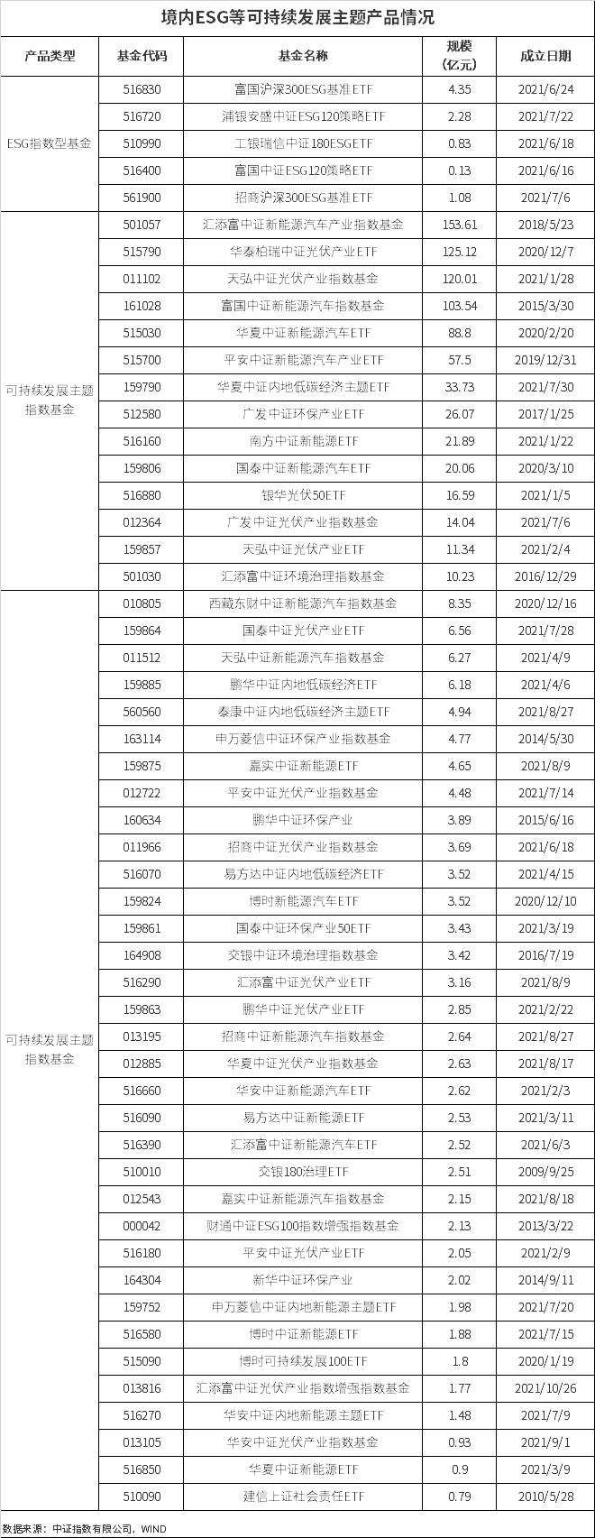境内ESG市场方面,中共中央、国务院印发《国家标准化发展纲要》,提出完善绿色发展标准化保障,建立健全碳达峰、碳中和标准以及绿色金融等绿色发展标准;国务院印发《2030年前碳达峰行动方案》,聚焦2030年前碳达峰目标,对推进碳达峰工作作出总体部署;上海市政府发布《上海加快打造国际绿色金融枢纽服务碳达峰碳中和目标的实施意见》,提出推动建立金融市场ESG信息披露机制,支持开发绿色股票、绿色债券、ESG相关指数,推出更多ETF等产品。