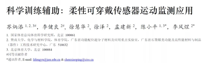 除了教学之外,苏炳添与国家体育总局体育科学研究所/北京体育大学陈小平、暨南大学化学与材料学院李风煜教授等人合作,从运动员训练中对各种体征信号采集、分析的需求出发,综述了近些年来柔性电子、光电集成传感器的最新研究进展,介绍了不同种类的运动信号检测方法,包括生物电位信号监测、电化学传感监测、光电容积描记法监测等。