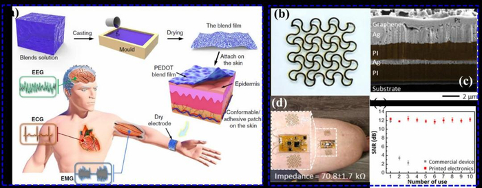在电极与皮肤的贴合性问题上,新加坡国立大学的欧阳建勇教授引入基于山梨醇修饰的PEDOT:PSS与水性聚氨酯复合的有机干电极薄膜,即使皮肤处于湿润条件下,电极仍能与皮肤实现良好贴合。也就是说,即使在运动出汗过程中,该电极仍能采集到高质量的肌电信号。
