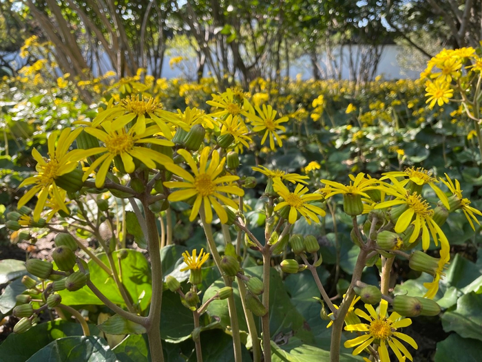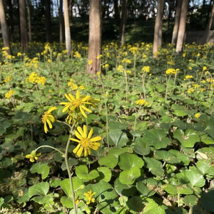 大吴风草喜欢半阴的环境,生命力旺盛,地面覆盖能力强,株形饱满,叶片形态奇特,花色亮丽,多种植于园林、庭院的阴处或者树下林间。在树木的遮掩下,它能很好地生长,绿树下开放着灿烂的金黄色花朵,看着极为赏心悦目。